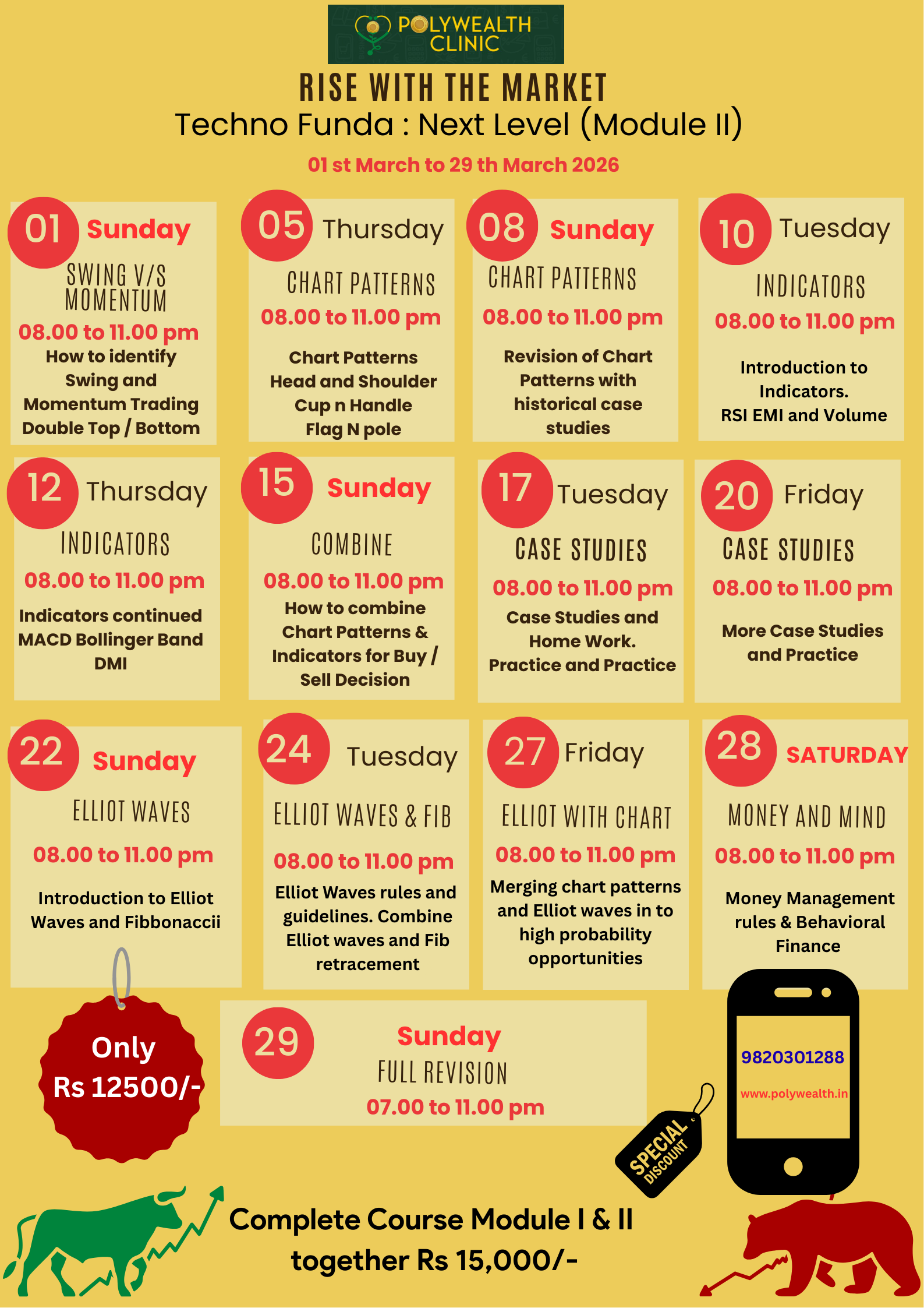 Advanced Elliot Waves, Options & Futures, Options Greeks, Options Strategy, Behavioural Finance, Risk Management, How to create a Portfolio